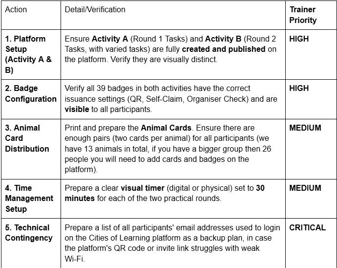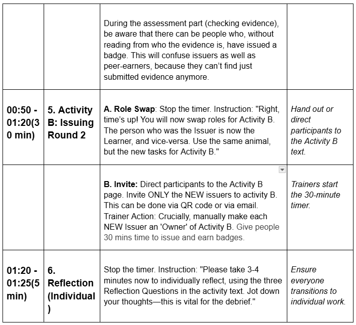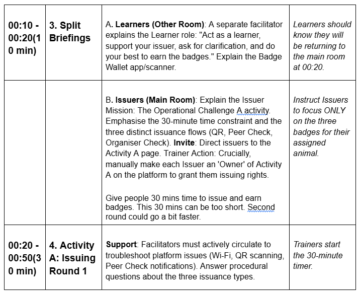 Belangrijk: Aan het begin van de workshop splitsen we de groep. De 'uitgevers' (de badge-uitreikers) en de 'lerenden' (de ontvangers) krijgen elk hun eigen instructies.