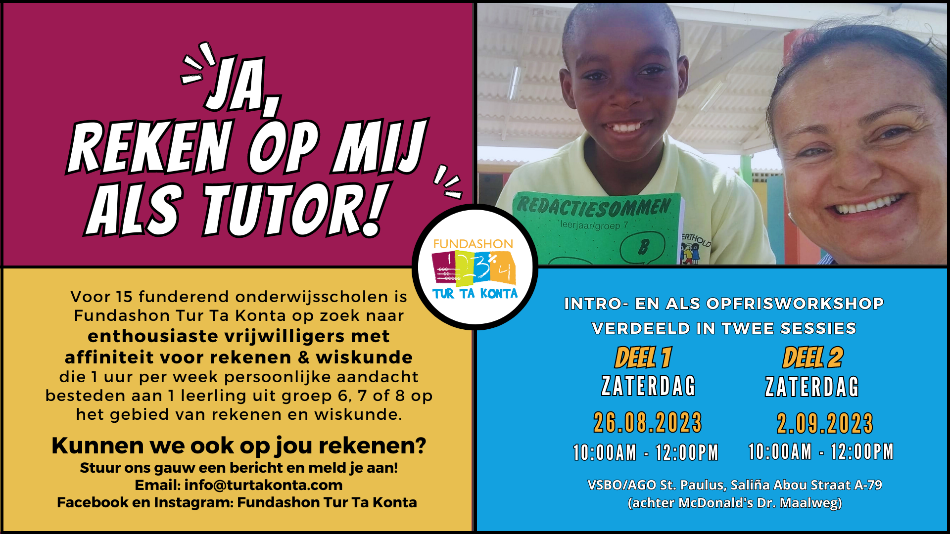 De workshop 'Vermenigvuldigen en Delen' biedt toekomstige rekentutors een diepgaand begrip van strategieën en benaderingen om leerlingen te begeleiden bij het ontwikkelen van sterke vermenigvuldig- en deelvaardigheden. De workshop met als subthema 'Vermenigvuldigen' is speciaal ontworpen voor vrijwilligers die zich willen voorbereiden om rekentutor te worden voor Fundashon Tur Ta Konta (FTTK). Deze workshop combineert traditionele rekenvaardigheden met 21ste-eeuwse competenties en biedt deelnemers niet alleen de mogelijkheid om hun didactische vaardigheden te verbeteren, maar ook om micro-certificering te behalen via Open Badges. Tijdens deze interactieve workshop zullen deelnemers de kunst van het effectief onderwijzen van vermenigvuldigen en delen ontdekken en tegelijkertijd waardevolle 21ste-eeuwse vaardigheden opbouwen. Deelnemers zullen hun eigen rekenkundige kennis versterken, leren hoe ze complexe concepten op een toegankelijke manier kunnen overbrengen en 21ste-eeuwse vaardigheden integreren in hun tutoringsessies.