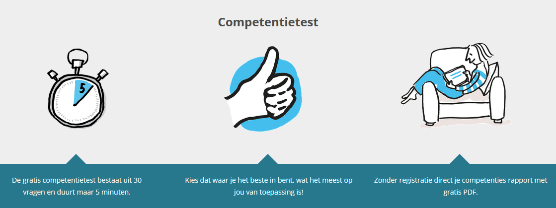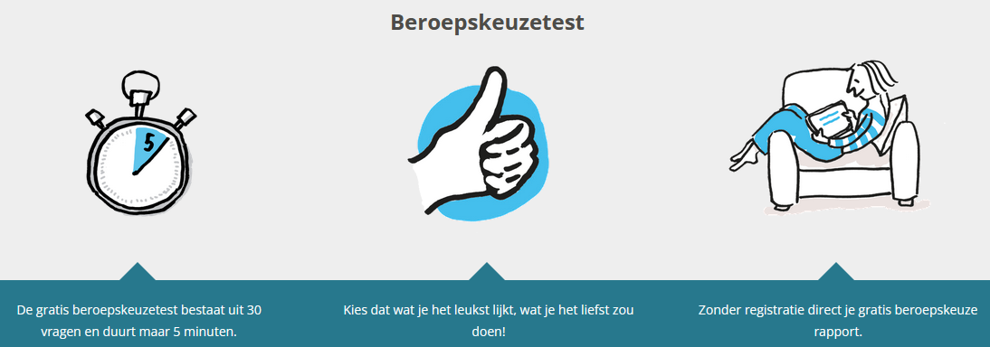 Met een loopbaantest krijg je meer zicht op jouw specifieke kansen en mogelijkheden voor je loopbaan. De testen werken met afbeeldingen en zijn daarom vrij snel en ook leuk om te maken. Alle testen zijn gebaseerd op bewezen theorieën zoals het RIASOC-model voor beroepskeuze of de Big Five persoonlijkheidstheorie. Ontdek bijvoorbeeld je soft skills met de competentietest, vind je droomberoep met de beroepskeuzetest of krijg inzicht in jouw persoonlijkheid met de persoonlijkheidstest.