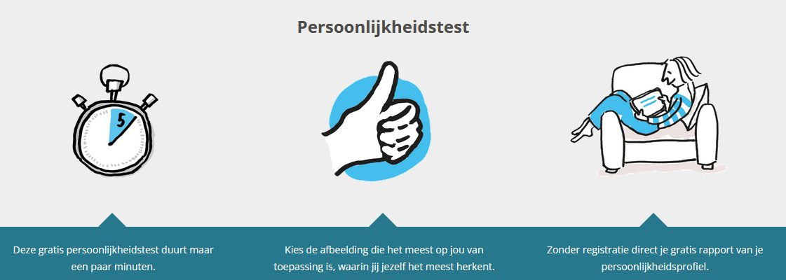 De testen bestaan voornamelijk ook uit visuele keuzemomenten en duren ongeveer 5 minuten per stuk. De tests zijn volledig anoniem en je hoeft dus geen persoonlijke gegevens in te vullen en kunt het resultaat direct na afronden downloaden en bewaren.