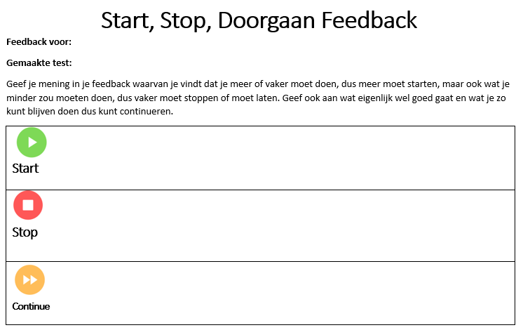 Geef daarbij aan wat je meer moet doen, wat je eerst niet deed (starten), wat je minder moet doen of waar je mee zou moeten stoppen (stoppen). En wat je zo zou moeten blijven doen omdat het goed gaat en het gewenste resultaat geeft. (doorgaan).